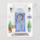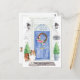 Mit unserer stilvollen Ankündigung kündigen Sie Ihre neue Adresse an: Shetland Sheepdog, blaue Haustür, Begrüßungsmatte, Schiefer-Schild, Topiaries und ein blumengeschmücktes Set auf grauem Backstein.