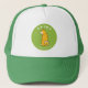 Fernlastfahrerhut mit einer Illustration und einem Entwurf von einem Shiba, sitzend nach einem Hintergrund des gelblichen Grüns.