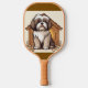 This paddle features an irresistibly cute, cartoon-style dog sitting proudly in front of a cozy wooden doghouse. The pup’s fluffy coat blends soft whites, grays, and blacks, giving it a friendly, expressive look—complete with a little pink tongue peeking out for extra charm. Scattered cartoon bones surround the scene, adding a fun, lighthearted touch that pet lovers will adore.