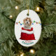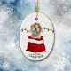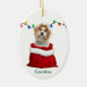 Auf der Vorderseite dieses Holiday-Ornament ist ein Bild eines bezaubernden schwarz-weißen Shih Tzu Hundes in einer rot-weißen Weihnachtsgeschenktüte. Hinter dem Hund befindet sich eine Reihe farbenfroher Urlaubslichter. Im Text unten steht "Frohe Weihnachten". Die Rückseite des Ornaments hat das gleiche Bild mit einem individuelle Name-Feld.