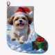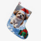 Shih Tzu läuft in Snow mit Weihnachtshut Großer Weihnachtsstrumpf