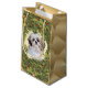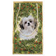 Niedlicher Shih Tzu vor einem Hintergrund dunkelgrüner Weihnachtskranke mit roten Birnenberry-Highlights.