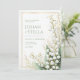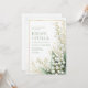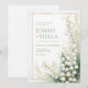 Capture a sense of ethereal luxury with this exquisite botanical illustration. This design features delicate, ivory-white Lily of the Valley bell flowers arching gracefully over lush, deep green ribbed leaves. A whimsical dusting of shimmering gold glitter and splatters dances across the clean white background, adding a touch of high-end magic. The entire scene is contained within a minimalist gold rectangular frame, offering a perfect balance between organic floral charm and polished modern sophistication. This botanical layout is a premier choice for an upscale spring wedding or a refined garden ceremony. The timeless combination of white, green, and gold makes it a flawless fit for a sophisticated bridal shower, a formal engagement announcement, or an elegant morning wedding reception. It pairs beautifully with wedding palettes featuring emerald green, metallic gold, champagne, and crisp white, offering a luxurious look for couples seeking a fine-art or classic romantic aesthetic.