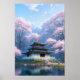 Ein bescheidener japanischer Shinto-Tempel, der in der üppigen Vegetation sichtbar ist, wird von den ruhigen Wellen des Flusses sanft überquert. Eine Explosion von Rosa- und Weißkirschblüten bildet den prächtigen Hintergrund der exquisiten Holzkonstruktion des Tempels. Sie spüren fast die sanfte Luft, die den angenehmen Duft der Kirschblüten mit sich bringt, während Sie sich dieses grafische Kunstwerk ansehen.