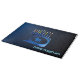 Eine moderne, metallische, blaue Chanukkah-Menorah mit einem Löwen in Silhouette, vor einem dunklen, nachtähnlichen Hintergrund. Alle neun Kerzen sind beleuchtet. Auch der hebräische Text "Chag Chanukkah Sameach" (Happy Hanukkah) erscheint in blau und weiß.