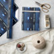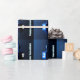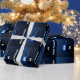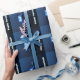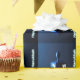 Ein modernistisches, metallisch blaues Dreieck vor einem dunklen, nächtlichen Hintergrund. Zwei der hebräischen Briefe, die auf einem dreifachen gefunden wurden, nun Nonne und glänzen, leuchten hell. Text liest "Happy Hanukkah" auch in leuchtend blau und weiß.
