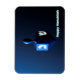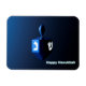 Ein modernistisches, metallisch blaues Dreieck vor einem dunklen, nächtlichen Hintergrund. Zwei der hebräischen Briefe, die auf einem dreifachen gefunden wurden, nun Nonne und glänzen, leuchten hell. Text liest "Happy Hanukkah" auch in leuchtend blau und weiß.
