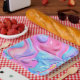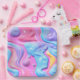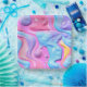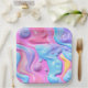 Farbenfrohe, leuchtend rosa, blaue, lila und gelbe Plastikabstraktion mit wirbelnden Blasen