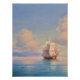A ship sailing off the coast on a calm sea, with a cloudy blue sky on the background. Oil painting in relaxing soft pastel colors by Ivan Aivazovsky.