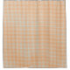 Shower curtain with a checked pattern in orange and white. The top image shows a flat view, and the bottom image shows it hanging in a modern bathroom.