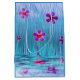 Ein digitales zeichn niedlicher, lila Blumen mit leuchtenden roten Mittelpunkten. Sie gucken Sie leise vom großen Gras neben einem Becken mit klarem, rippendem Wasser an.