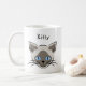 Diese leicht zu personalisierende Tasse zeichnet sich durch niedliche grafische Kunstwerke aus, die das Gesicht einer siamesischen Katze in kräftigen Farben darstellen, das Licht auf der einen Seite und das Dunkle auf der anderen Seite, beide mit blassblauen Augen.