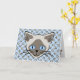 Diese Grußkarte, die leicht für einen Geburtstag oder eine Veranstaltung angepasst werden kann, weist ein Design aus grafischen siamesischen Katzengesichtern in einer hellen und dunklen Version mit blassblauen Augen auf.