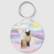 Ein Schokolade Siegel Point Siam Katzengel sitzt in den weichen pastellfarbenen Wolken des Himmels.