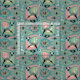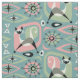 Meine originelle Vektorgrafik von abstrakten Katzen, Würfeln, Sternexplosionen, Boomerang, Lozenges, und mehr, in Rosa, Grün, Mocha, hellbraun, und schwarz auf blau.