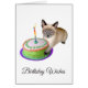 Ein siamesisches Kätzchen mit einem Geburtstagskuchen mit einer Single-Kerze. Schicken Sie diese Geburtstagskarte an jeden Katzenliebhaber.