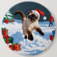 Siamische Katze läuft im Schnee mit Weihnachtsmütz Button