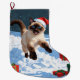 Siamische Katze läuft im Schnee mit Weihnachtsmütz Großer Weihnachtsstrumpf