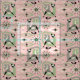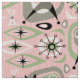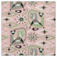 abstrakte siamesische Katzen, Würfel, Sternexplosionen, Boomerang, Lozenges, und vieles mehr, in Mocha, grün, hellbraun, schwarz und ein Hauch von Blau auf strukturiertem Rosa.