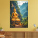 This stunning artwork captures a colossal Golden Buddha statue seated in deep meditation, set against a dramatic backdrop of lush Thai jungle cliffs. The vibrant gold of the statue radiates warmth, contrasting beautifully with the deep emerald greens and misty blues of the towering limestone karsts and dense foliage. The gentle light illuminating the scene creates an atmosphere of profound tranquillity and spiritual power.
