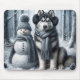Ein flauschiger sibirischer Husky mit Schal und Ohrmuffen sitzt neben einem fröhlichen Schneemann mit Hut und Schal