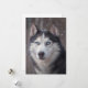 Dieses Digitalbild zeigt einen sibirischen Husky, der auf Schnee stehend ist. Das Fell glänzt mit frostigen Highlights, während sich die Winterlandschaft endlos hinter sich erstreckt. Die ausdrucksvollen Augen des Hundes erwecken die Aufmerksamkeit des Betrachters.