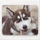 Sibirischer Husky Welpe braun und weiß mit blauen Augen fressen Stock Holz am Strand.