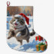 Sibirische Katze läuft im Schnee mit Weihnachtsmüt Großer Weihnachtsstrumpf