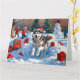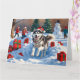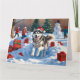 Sibirischer Husky läuft im Schnee mit Weihnachtsmü Karte