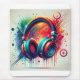 Farbenfrohe Kopfhörer in lebendigem, künstlerischem Stil mit abstraktem Spritzer-Hintergrund, der Musik und Kreativität hervorruft.