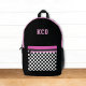Dieses lustige Kinder-Rucksack-Design verfügt über eine schwarze, weiße, rosa und magentafarbene Farbpalette mit karierten Taschen und Initialen. Es ist ein lustiges, modernes Design für alle Altersgruppen!