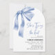 Mit dieser blauen Bow Bridal Shower Einladung fügen Sie Ihrem Fest eine Touch Eleganz hinzu. Mit einem schicken blauen Bogen und sanften, neutralen Tönen, "She's Tying the Knot" Brautparty Party, schick und modern Brautparty