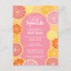 Weiße Zitrusfrüchte in den Farben Zitrone, Rosa, Korallen, Orange und rubinrote Grapefruits. Die handgezeichneten Zitrusscheiben enthalten eine Aquarellfarbe, die eine saftige Ergänzung zu einer farbenfrohen Polterabend-Einladung darstellt.