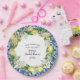 Diese Papiertafel aus Brautparty wurde zur Koordination mit der Jenny's Lemon Collection entworfen und weist einen gelben Zitronen- und Blumenkranz auf. Die blauen Kacheln sind um den Rand des runden Aufklebers herum eingeprägt. Sie fand, dass ihr Hauptpresse den Brautparty-Text beginnt. Der Name und das Brautparty der Braut sind in einem modernen und trendigen Schriftart geschrieben. Das Datum vervollständigt den Text. Der gesamte Text ist bearbeitbar.