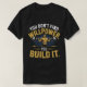 Dieser schwarze T - Shirt enthält den motivierend Text "You don't FIND WILLPOWER, YOU BUILD IT.", der um eine zentrale Grafik angeordnet ist. Das Wort "WILLPOWER" ist groß und in einem fett gelben Schriftart mit dunkler Kontur. Die Grafik zeigt einen muskulösen Menschen, der ein hellhäutiger Mann zu sein scheint, der einen Barbell über die Schultern hält, was auf eine Squat-Übung hindeutet. Der Hintergrund ist blau und grau strukturiert.