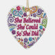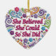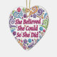 Ein bunter Entwurf der Blumen und des Schnörkels, die das motivierend Sprichwort, "sie kennzeichnen, glaubte, dass sie könnte, also sie" auf einer Herz geformten Weihnachtsbaum-Keramik-Verzierung tat.