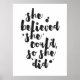 Inspirationsposter mit dem Satz "Sie glaubte, sie könnte es, so tat sie es" in schwarzen Pinselskripten mit einer Bio Farbtextur, um einen authentischen, handgeschriebenen Look zu erreichen. Das Design ist so konzipiert, dass es auf allen portraitorientierten Postergrößen großartig aussieht. Bitte machen Sie Karo, wenn das Bild nach dem Ändern der Postergröße neu positioniert oder vergrößert werden muss.