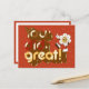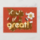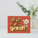 Feiern Sie Errungenschaften mit dieser Retro-inspirierten Postkarte "You did Great!" mit spielerischer Typografie und einem fröhlichen Blume-Maskottchen. Ideal für Abschlüsse, Werbeaktionen oder andere Feierlichkeiten! Passen Sie die Farben des Textes, der Blume und des Hintergrunds so an, dass sie mit Ihrem Stil oder den Lieblingsfarben des Empfängers übereinstimmen. Ein lustiger und vielseitiger Weg, Positivität und Ermutigung zu verbreiten!