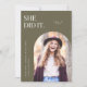 Moderne Abschluss-Anzeigenkarte mit einem olivgrünen Bogen-Rahmen für Ihr Foto. Im Text steht: "SIE HAT ES GETAN."