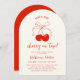 Feiern Sie Liebe und Freude mit dieser charmanten Braudusche zum Thema Kirsche! Dieses Design mit einer skurrilen roten Kirschillustrierung, verbunden mit einem Bogen und Retro-ecru Hintergrund, ist perfekt für ein spielerisches und süßes Brautparty Thema. Die stilvolle Typografie fügt eine moderne Touch hinzu, die sich ideal für trendige Feiern eignet.