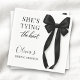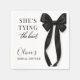 Partytücher mit einem klassischen schwarzen Bogenmotiv und dem Satz sie knüpft den Knoten. Entworfen für ein sauberes, elegantes Aussehen, das gut zu schwarzer und weißer Hochzeitsdekoration passt. Geeignet für Brautduschen, Verlobungsfeiern, Junggesellinnenabschiede und Hochzeitsfeiern. Vollständig anpassbarer Text mit einem druckfertigen Design für Cocktail- oder Mittagessenstücher.
