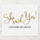 Ein moderner Goldskripttext mit She Said Yes im minimalistischen Stil mit Ihren individuellen Namen unten in einem einfachen modernen Schriftart.