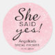 Liebliche personalisierte Aufkleber/Etiketten für Brautparty Geschenkideen oder Umschlag Aufkleber. "Sie sagte ja!" Formulierung mit Imitaten rosa Glitzer Hintergrund Muster. Imitate Gold Konfetti. Bearbeiten von Vorlagen - Hinzufügen von Texten.