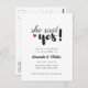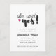 Einfach schwarz-weiß "sie sagte ja" Design Engagement Party Einladung in einem Typografie-Design mit Pinselskript und einfachen Block Schriftart. Passen Sie die Namen, das Datum und die Uhrzeit des Party und den Ort des Paares an.