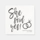 Eine lustige und einzigartige, mit Skripten versehene Serviette, die speziell auf Ihr zukünftiges Verlobung-Dinner oder Party zugeschnitten ist. Es enthält die Worte "She Said Yes!" mit Hochzeitsringen daneben. Unter diesem und darüber sind die Namen der Braut und des Bräutigams und die Verlobung oder das Hochzeitstag.