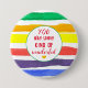 Ein farbenfroher Knopf mit positiven Worten "Sie sind eine Art wunderbar" auf einem mit Aquarellfarbe bemalten Hintergrund mit Regenbogenstreifen. Der innere Kreis hat ein winziges orangefarbenes Herz, das sich in der Größe anpassen oder entfernen lässt. Jede Zeile des roten Textes ist anders, aber alle gehören derselben Schriftart-Familie an, und sie können auch angepasst werden. Wer würde nicht die Liebe haben, so etwas Fröhliches in der Post zu bekommen, als an Sie als Geschenk zu denken?