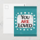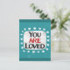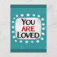 "You Are Loved" ist ein niedliches inspirierendes oder motivierend Zitat mit einer weißen Akzent-Form, umgeben von weißen texturierten whimsical Punkten.