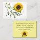 Diese "You Matter with Sunflower and Encouraging Message Note Card" zeichnet sich durch eine lebendige Sonnenblume auf der Vorderseite aus, die Positivität und Glück symbolisiert, wobei die Worte "You Matter" schön in hellgrün und dunkelgrün dargestellt werden. Auf der Rückseite bietet eine anpassbare Botschaft aufdringliche Ermutigung: "Du bist mir wichtig, und du bist für Gott wichtig. Nichts sonst sollte Sie jemals daran zweifeln lassen, dass Sie es wert sind." Die Botschaft lautet: Set vor einem hellgelben Hintergrund, das die Blütenblätter der Sonnenblume spiegelt, und gerahmt durch eine hellgrüne Grenze, die das Design der Vorderseite ergänzt.