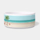 Desteis originelle Cartoon-Illustration eines niedlichen Siegel und Weiß-Farbe Italienische Windhund / Iggy Rasse Hund stehend in einer tropischen Sommer Strand-Szene. Der beige Sand ist mit einer Palme, einer rosa Muschel, einem Seestern und einer roten Krabbe verziert. Das Wasser ist türkisblau mit einigen Wellen und die Sonne scheint über dem Horizont. Es gibt auch einen personalisierbaren Textbereich für einen Namen.