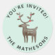 Das Rentierdesign der Theme Parties zeigt eine skandinavische Rentiere mit roten Urlaubstöbeln auf ihren Geweih und ihren Namen in der modernen Blockschrift neben "You're Invited!" 🥰 Set auf einem pastellfarbenen Minzgrün, das Sie individuell gestalten können. Dieser Aquarellaufkleber bringt Launen und Fröhlichkeit für jede Einladung! #Reindeer #Christmas #YoureInvited